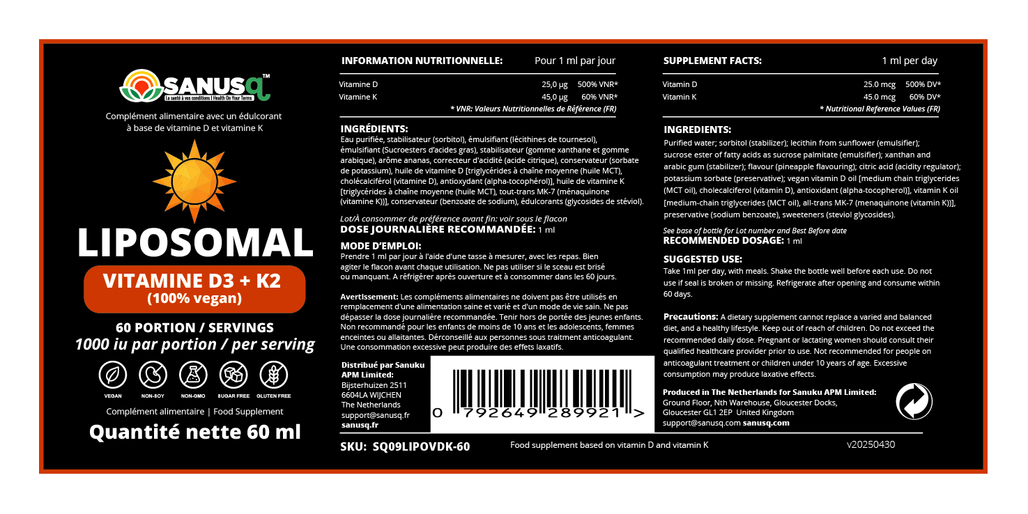 SANUSq Health : Vitamines D3+K2 liposomiques - 60ml